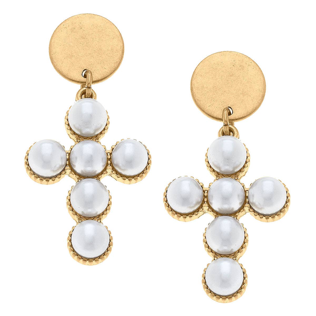 Elisha Pearl Cross Drop Earrings in Worn Gold