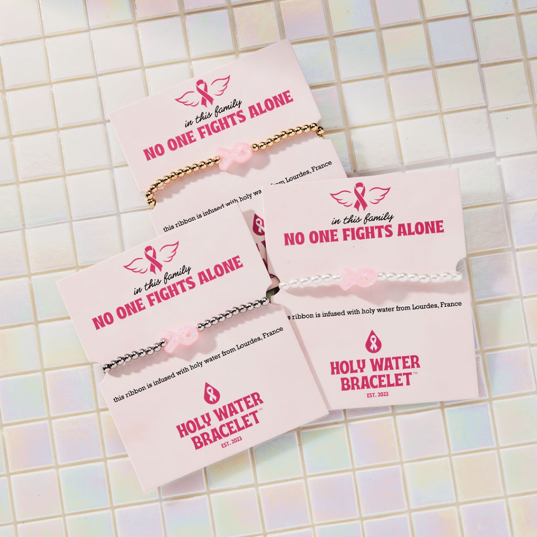 A daily reminder that in this family, no one fights alone! The pink ribbon charm is infused with authentic holy water sourced directly from Lourdes, France. - 4mm crystal pearl beads - Flexible stretch cord - Resin pink ribbon charm is infused with authentic holy water from Lourdes, France - 6.8 inch unstretched circumference (similar to a regular-sized bracelet)